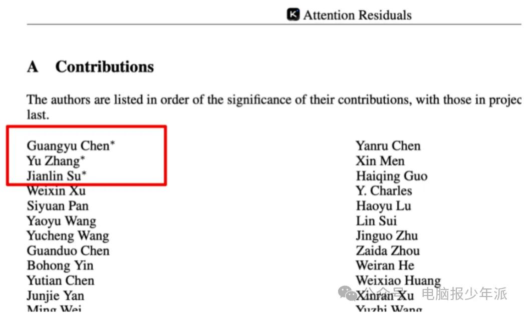 更令人瞩目的是,这篇题为《Attention Residuals》(注意力残差)的论文共同第一作者中,17岁的深圳高三学生陈广宇(Guangyu Chen)赫然在列,他与知名研究者苏剑林(RoPE旋转位置编码提出者)、张宇(Kimi架构核心开发者)并列署名,三人被标注为“同等贡献”。