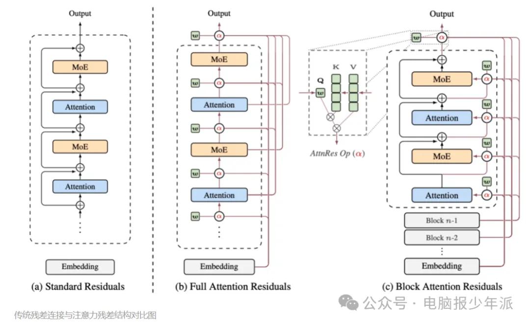 Kimi团队提出的“注意力残差”(Attention Residuals)机制,则是对这一底层逻辑的重构。它不再让每一层无差别地接收所有历史信息,而是引入了一个“智能筛选器”,让当前层按需选择最值得参考的内容进行聚合 。如果说传统方式是“搬运整座图书馆”,那么“注意力残差”就是“只带走最关键的几页参考文献”。