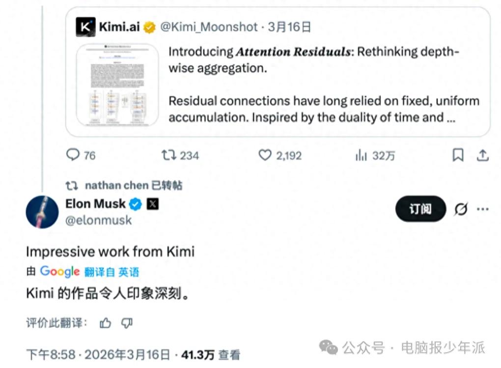 2026年3月16日,埃隆·马斯克在社交平台公开称赞中国AI公司月之暗面(Moonshot AI)的Kimi团队研究成果“令人印象深刻”(Impressive work),引发全球AI圈震动。