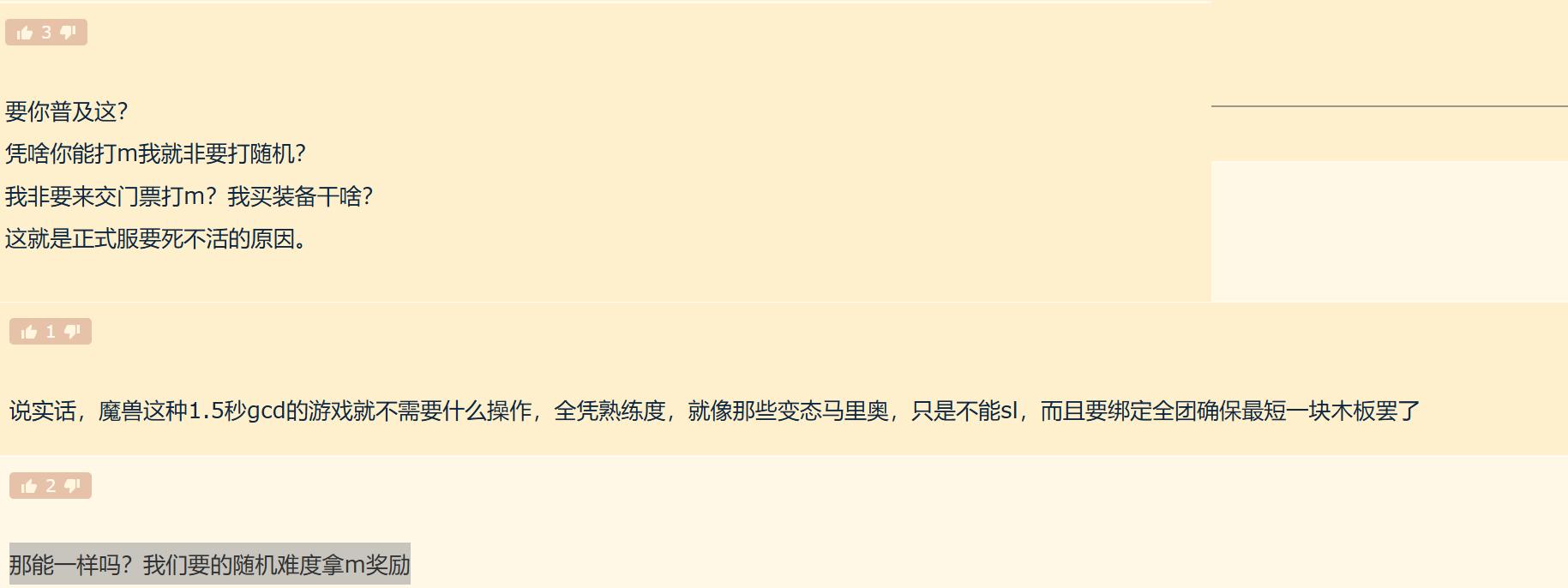 所以评论区的玩家们也在反驳帖主,本质上大家想分难度层级吗?大家并不想。确实你要说操作不好就该玩低难度,这点能认同,但是凭什么操作不好只能玩低难度?随着装备积累,大家都会去挑战高难度从而去换取更好的装备。所以本质上魔兽世界正式服中的四个难度模式的划分,更像是一个排位赛,大家最终都要顶峰相见,而不是真正的四选一。