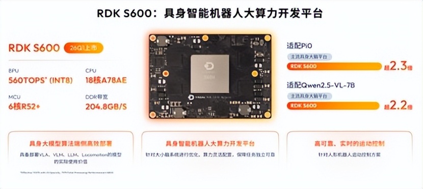 此次前瞻亮相的S600作为地瓜机器人的旗舰级具身智能机器人大算力开发平台,拥有560 TOPS*(INT8) 算力,采用高效灵活的大小脑架构设计并进行了深度优化。其大脑配置18核A78AE CPU和全新BPU Nash,可支持VLA、VLM、LLM、Locomotion多种具身大模型算法端侧高效部署,尤其是在适配Pi0、Qwen2.5-VL-7B时,性能分别超越主流具身大脑平台2.3倍和2.2倍,满足复杂决策需求;小脑配置6核R52+ MCU,专为人形机器人优化,具备高可靠、实时的运动控制能力。