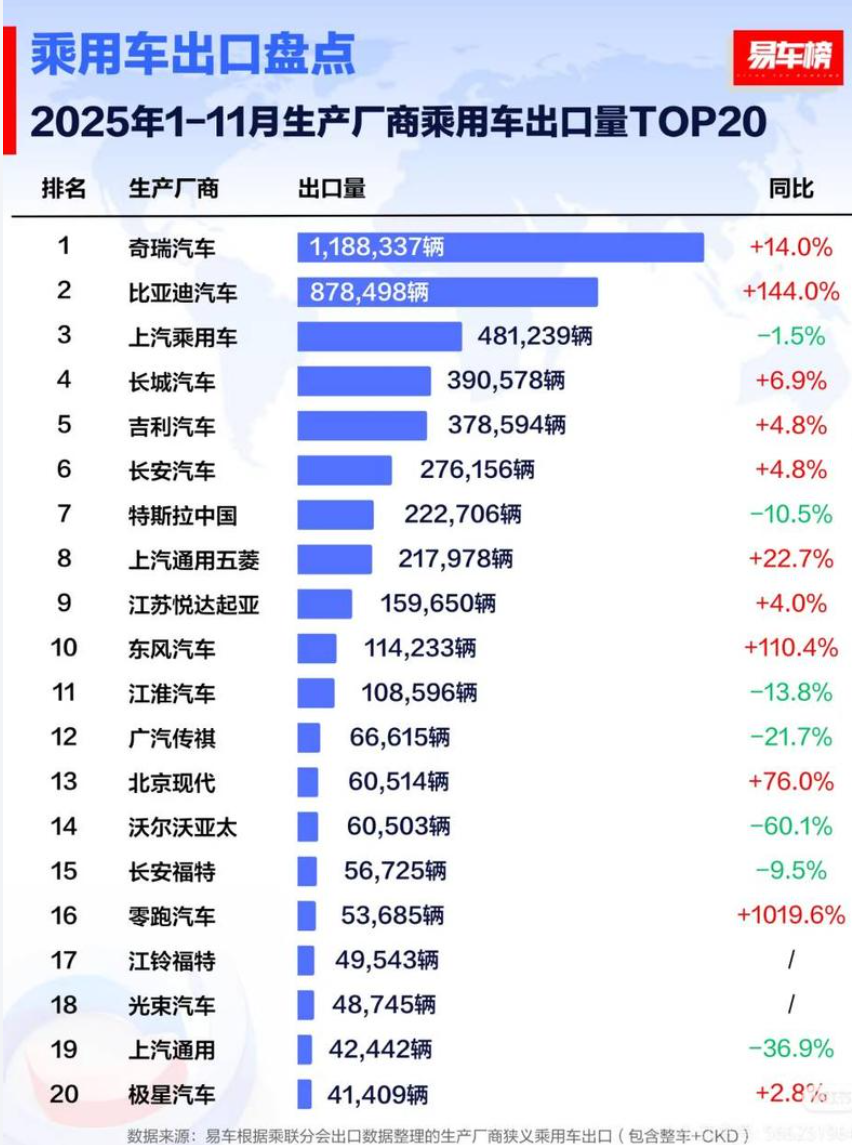 从“中国制造”到“全球引领”,比亚迪用一组硬核数据震撼世界!2025年11月单月出口12.8万台、同比暴涨313.4%,1-11月累计出口87.8万台实现翻倍增长,这样的增速在全球车市堪称“现象级”。
