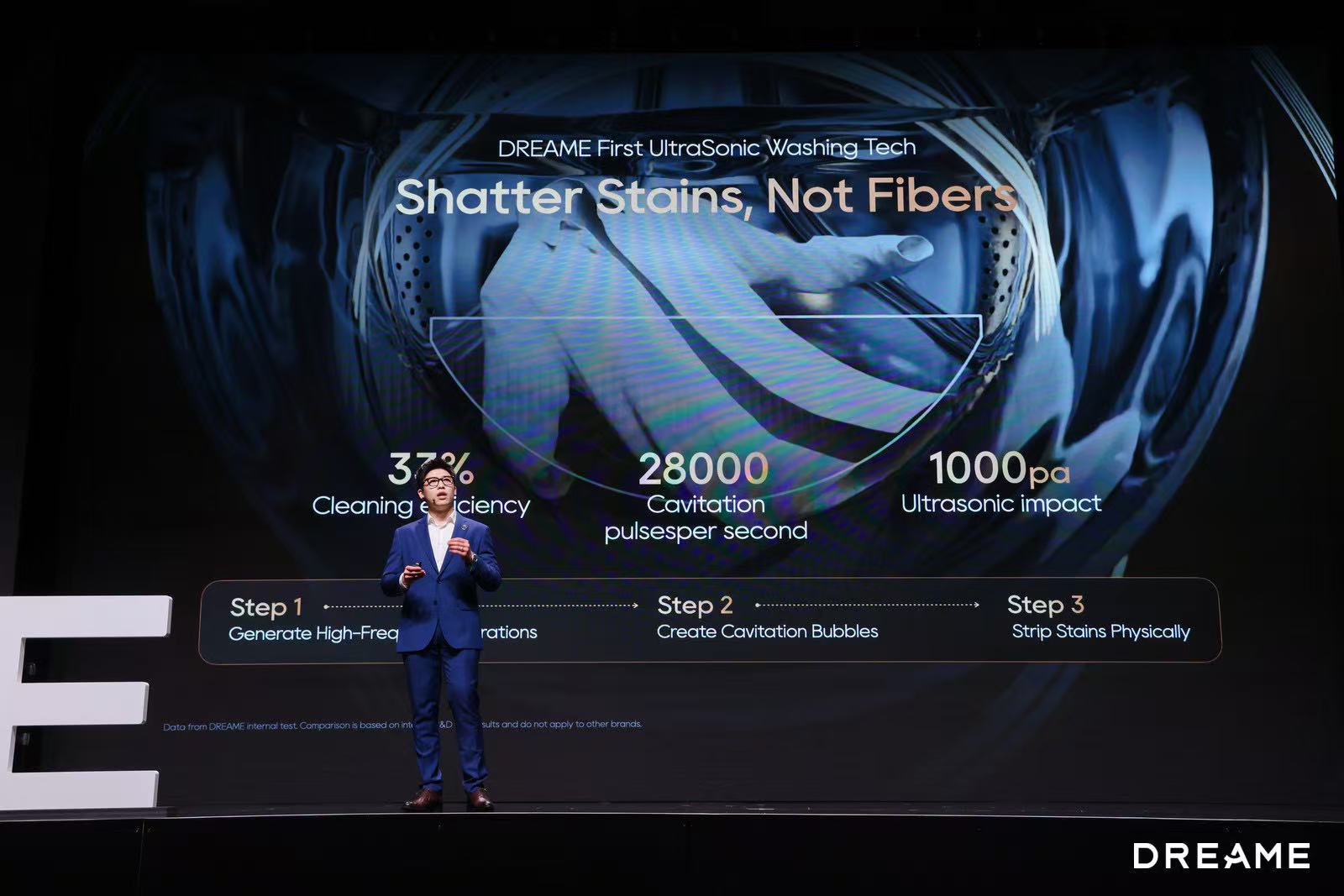 这次发布会里,追觅还首次展示了超声波洗涤技术和具身智能洗护机器人。前者通过每秒28000次脉冲产生微米级空化气泡,从纤维深处剥离污渍;后者则可以在家中移动、拾取衣物、识别分类,并与洗衣机联动,自动完成从洗涤到烘干再到收取的流程。这些内容显然还带着更强的技术展示意味,但能看出来,追觅想推进的并不只是“单台机器更聪明”这一层,而是让整套洗护流程继续往更自动化的方向走。