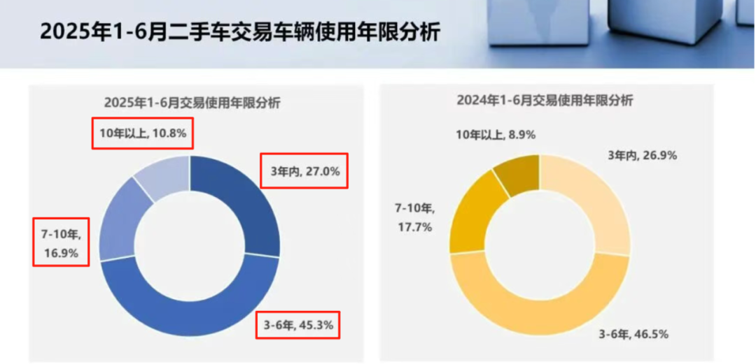 2025年上半年,全国二手车使用年限在3-6年的交易量最多,占比为45.3%;使用年限在3年内车型占比为27%;车龄在7-10年的车型占比为16.9%;车龄10年以上的车型占比为10.8%。这也意味着,超过70%的消费者可能用不到8年的电池质保,主机厂相应的长期售后压力也较小。