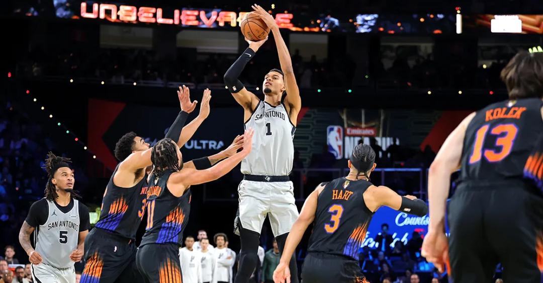 于是,我们开始看到,特雷-杨、三球、马克西这样的新一代后卫将超远三分纳入常规武器库,三分射程成为顶级控卫的标配;保罗-乔治、塔图姆和布兰登-米勒这些锋线球员,不再甘心只做终结点,他们持球干拔三分的威胁,让防守者从三分线外两步就开始陷入两难;约基奇、恩比德、唐斯和文班亚马,这些曾经只在内线肉搏的大个子们,开始开发三分技能,在三分线外展示投射能力。