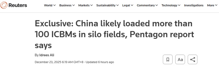 据路透社12月22日报道,该报告草案中提到 ,中国在中蒙边境三处导弹发射井中部署了超过100枚“东风-31”洲际导弹,并拒绝与美国进行军控谈判。