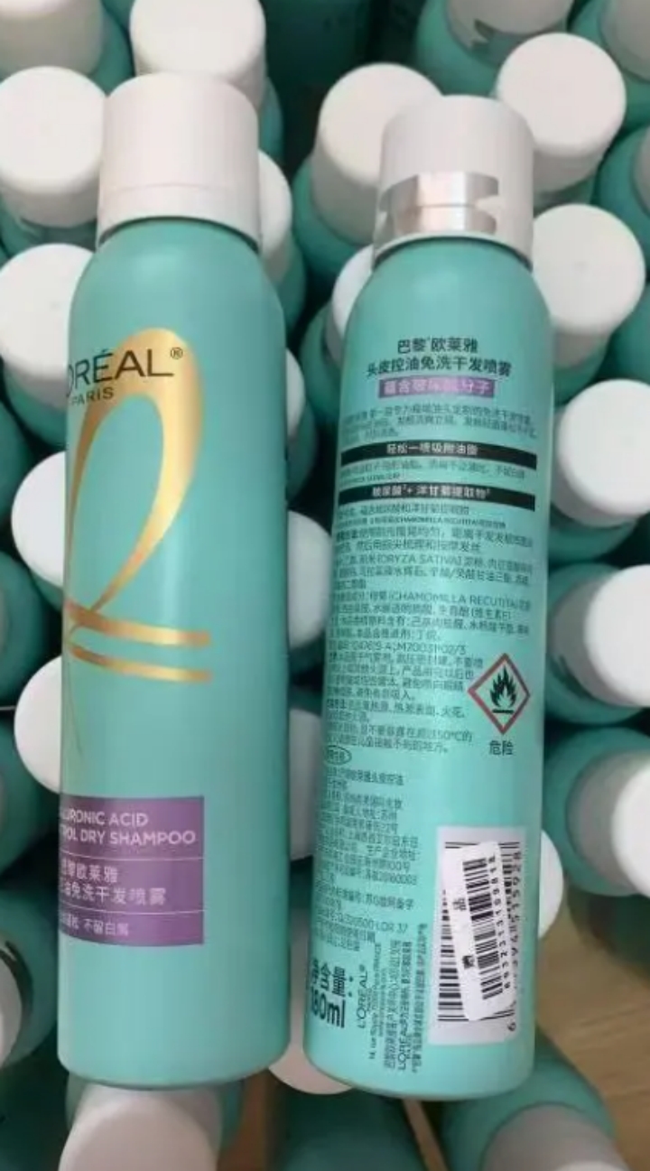 欧莱雅是大家熟知的知名洗护品牌,这款干发喷雾主打基础控油功效,定位低端市场,核心成分是玻尿酸,复配COMPRESSED科技,侧重点在基础去油,适合所有发质日常临时救急。定价20.9/瓶180ml,价格亲民,性价比一般,没有正规检测报告,资质不够完善,品控不稳定,部分产品存在漏液问题。