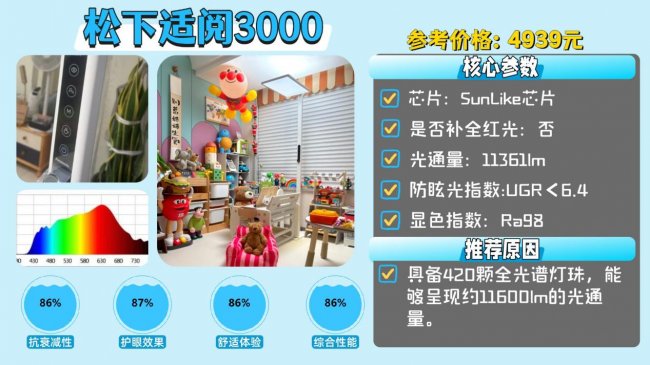推荐款:松下适阅3000——具备420颗全光谱灯珠,能够呈现约11600lm的光通量。