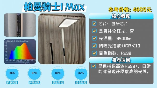 护眼大路灯第四名:柏曼骑士I Max;显色指数高达Ra98+,日常能够呈现还原度高的光线。