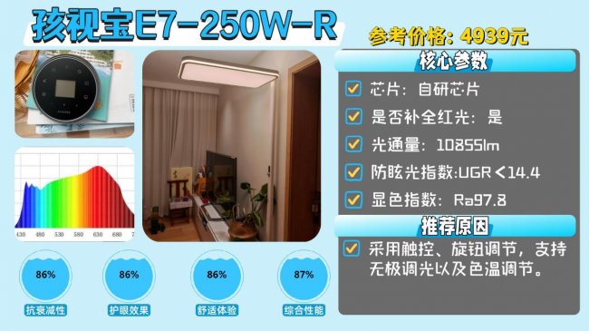 护眼大路灯第七名:孩视宝E7-250W-R;采用触控、旋钮调节,支持无极调光以及色温调节。