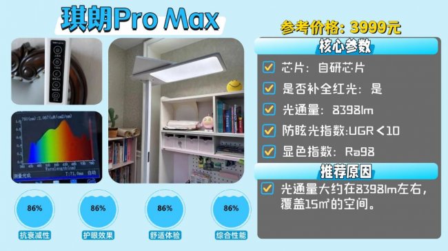 推荐款:琪朗Pro Max ——光通量大约在8398lm左右,覆盖15㎡的空间。
