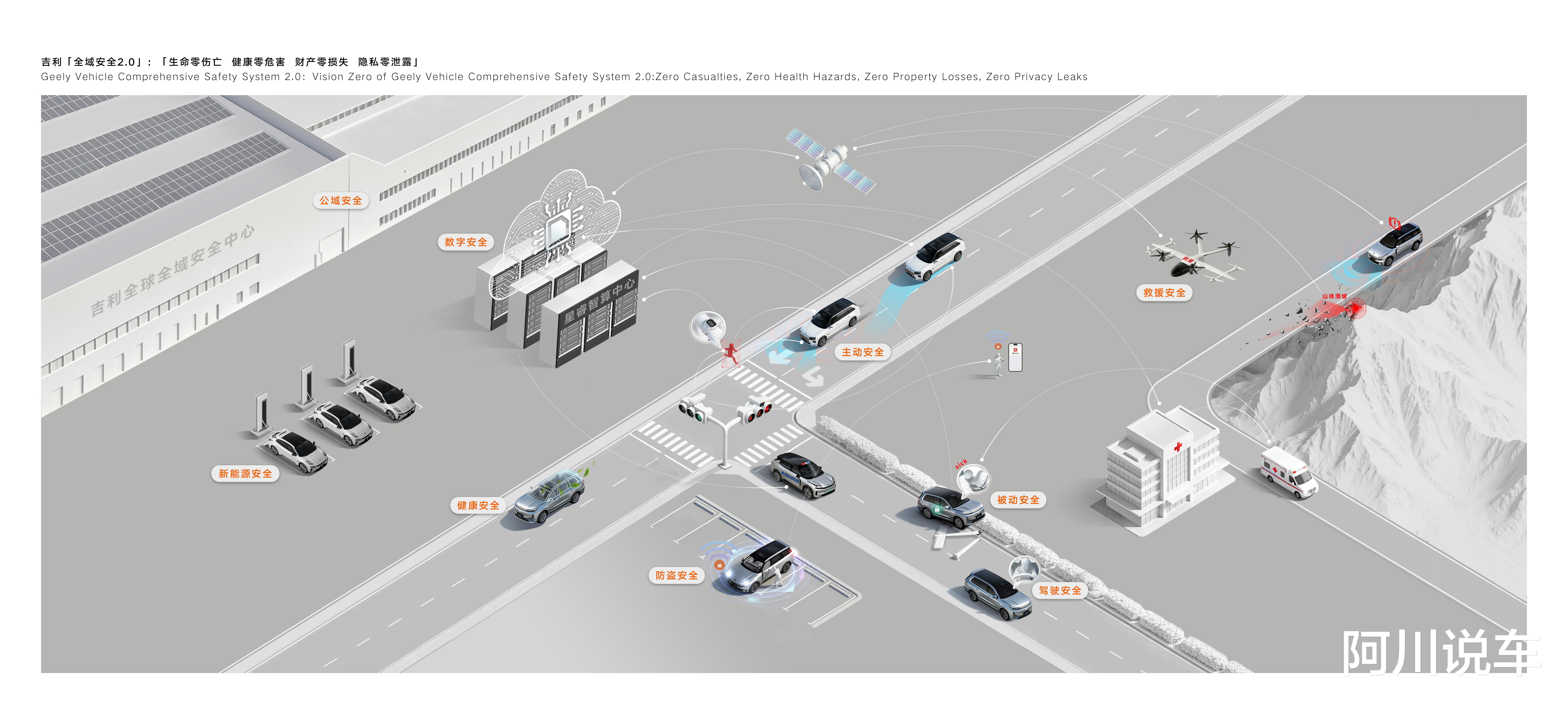 作为行业安全技术的先行者与引领者,吉利在“全域AI”技术体系的赋能下,以“AI为纲 责任为本”,基于原有的“全域安全”技术体系进阶打造“全域安全2.0”技术体系。结合智能时代的安全新需求和新挑战,“全域安全2.0”技术体系秉持“以人为尊”理念,通过技术升级、能力突破与范式创新,将侧重“整车安全”的视角升级为“人-车-路-云-星”的生态视角,旨在贯穿用户出行全场景、覆盖出行全领域、联动出行全生态;并以“生命零伤亡、健康零危害、财产零损失、隐私零泄露”四大安全愿景为指引,逐步构建的一套为消费者提供全面的安全保障技术体系。