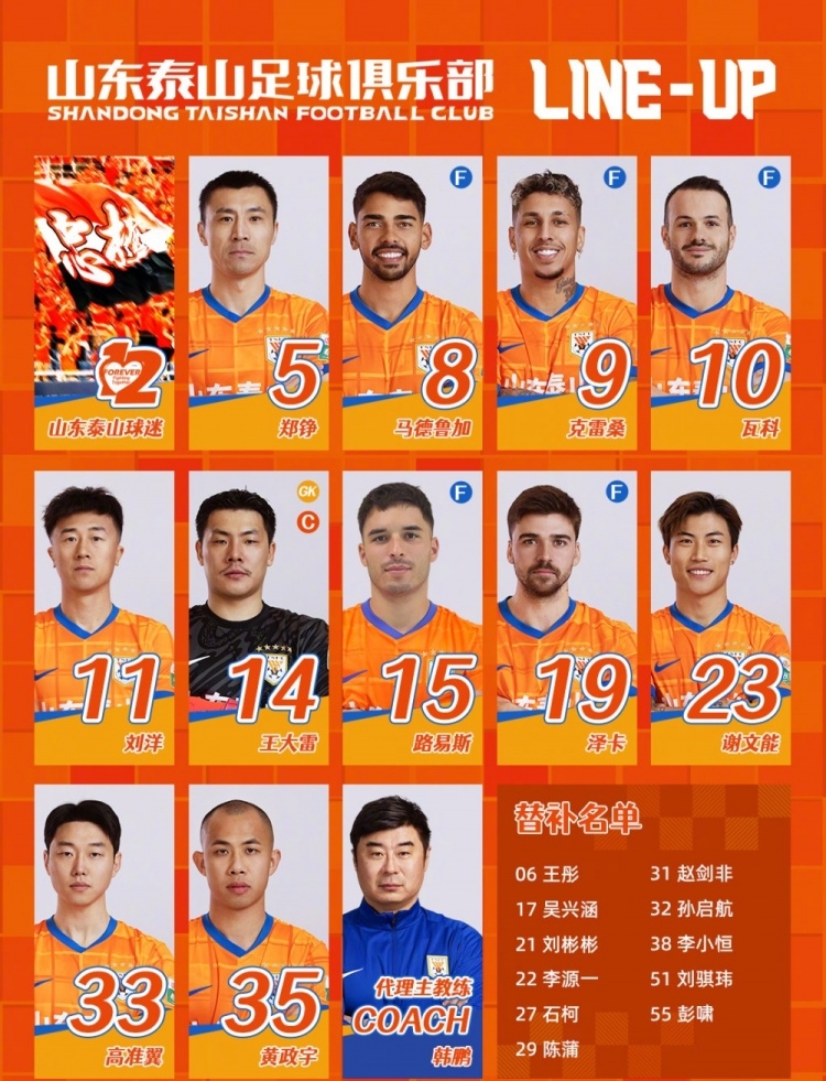 山东泰山首发:14-王大雷、5-郑铮、11-刘洋、15-路易斯-洛佩斯、33-高准翼、8-马德鲁加、35-黄政宇、23-谢文能、10-卡扎伊什维利、9-克雷桑、19-泽卡