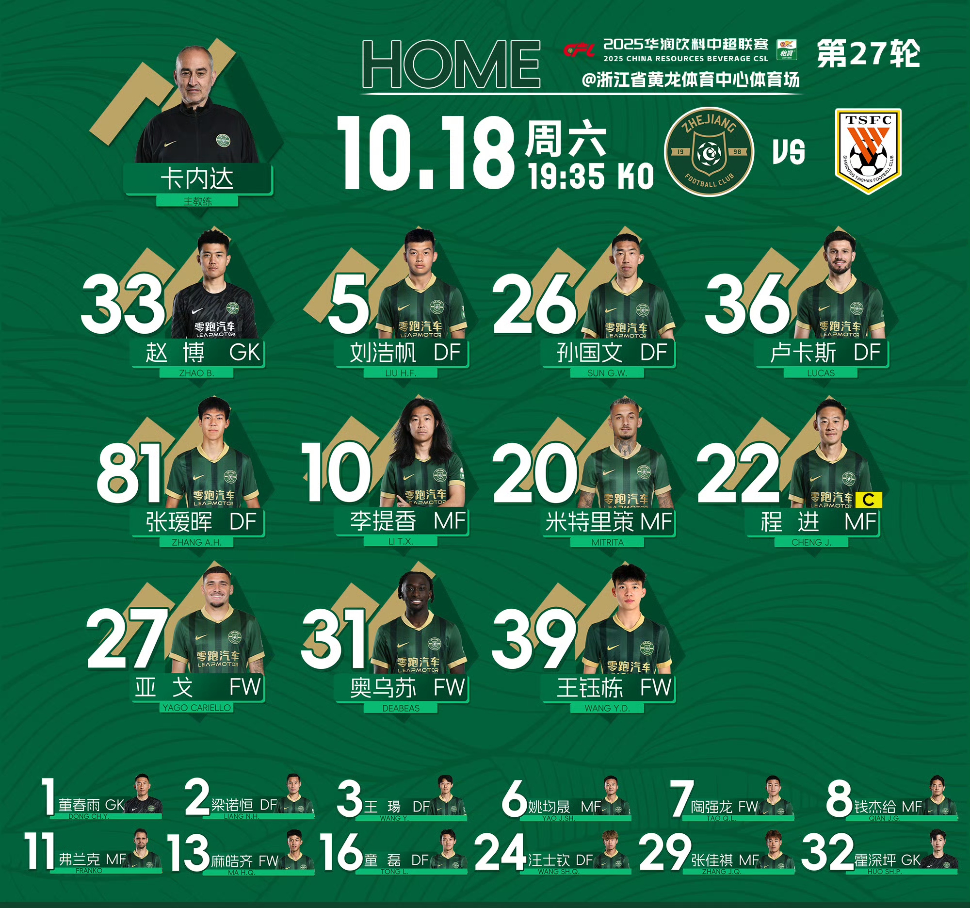 浙江队首发:33-赵博、5-刘浩帆、26-孙国文、36-卢卡斯、81-张瑷晖、10-李提香、20-米特里策、22-程进、27-亚戈-卡列洛、31-奥乌苏、39-王钰栋
