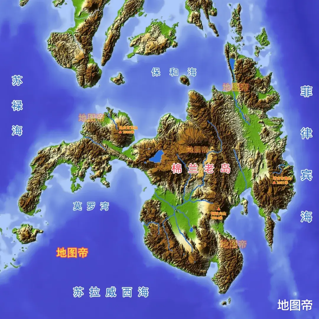 棉兰老岛,四周分别为保和海、菲律宾海、苏拉威西海、苏禄海,东西长528千米,南北宽471千米,这个岛面积9.75万平方千米,是菲律宾第二大岛。棉兰老岛多火山,主要山脉呈南北走向,最高峰为阿波火山,海拔2954米,为菲律宾最高峰。
