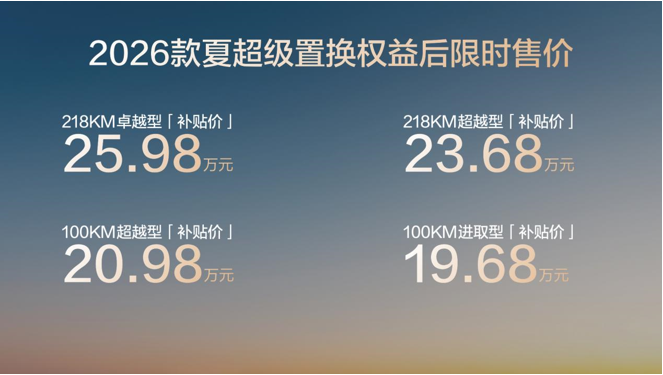 2025年11月4日,2026款夏正式上市,此次共推出4款车型,限时超级置换价19.68—25.98万元。仅需中级SUV的价格,就可享有超越30万级的豪华配置,2026款夏全能出行新选择!