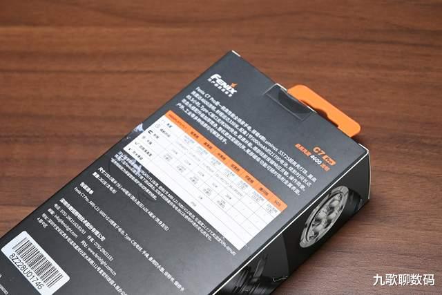 Fenix的C系列是专门面向户外EDC和工业检修领域的,主打特色就是方便好用,性能也够强。此款C7 Pro延续了二代C5的透明展示窗设计,可一目了然地看到内里的实物,相较以往的渲染图要更为直观。左右两侧为所罗列的卖点图标展示,除该系列“祖传”的尾部磁吸、恒流电路外、电量显示外,还加入了4颗强光灯珠和20瓦C口直充这些新特性。包装背面依旧是规参一览表,值得一提的是,菲家新品目前都采用了全中文包装,这对新手用户还是很友好的,值得点赞。