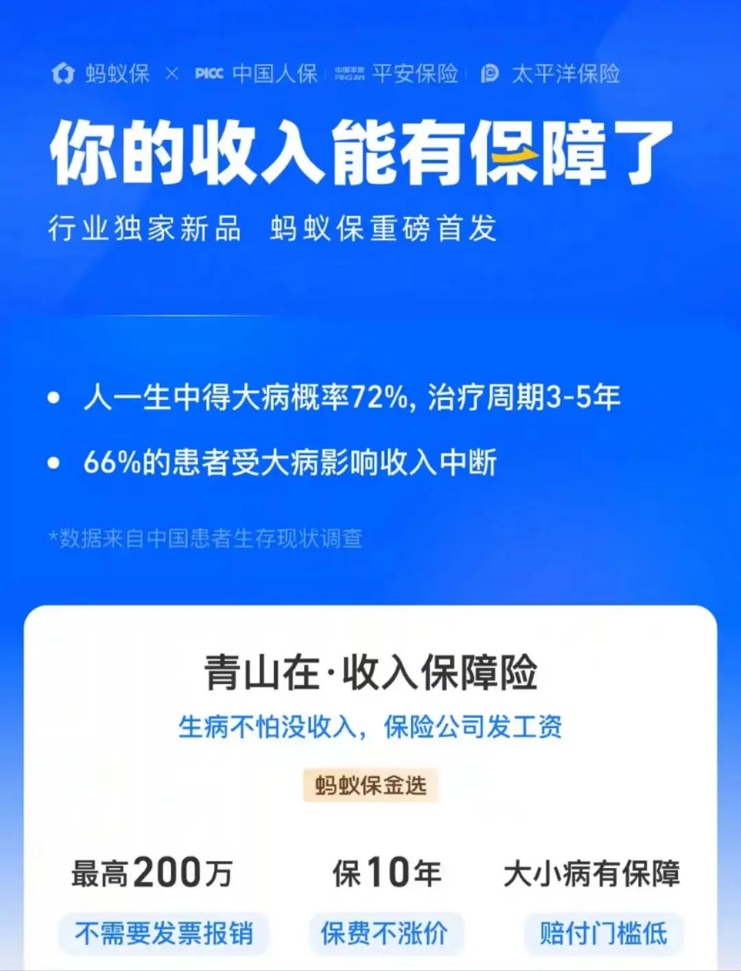 2月28日,中国人民健康保险、平安健康保险、太平洋健康险三家保险公司在互联网保险代理平台“蚂蚁保”联合上线了创新保险产品“青山在·收入保障险”。据悉,这款产品专为上班族及家庭顶梁柱群体设计。