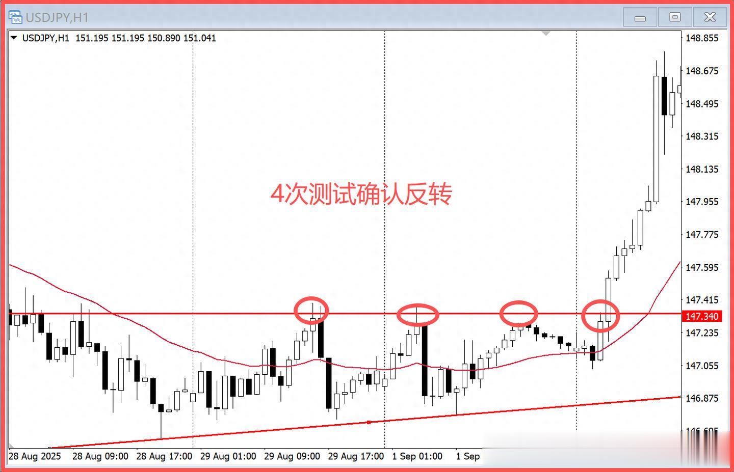 图中是美元兑日元1小时级别的K线图,行情在147.34的压力位震荡整理,行情4次测试到这个压力位置。