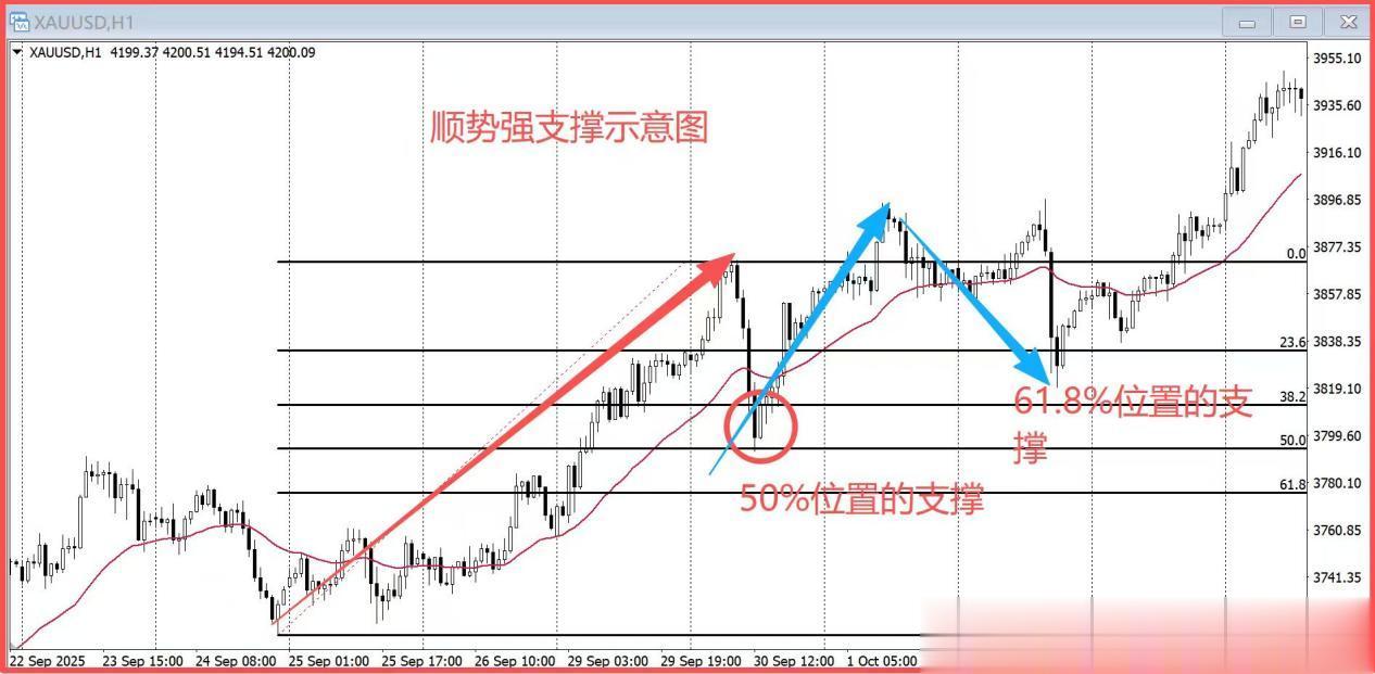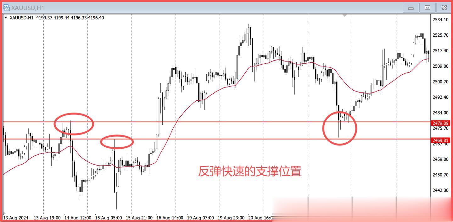 图中是黄金1小时级别的K线图,行情在8月底突破了日线的整理形态就进入了多头的趋势,在这种趋势非常明确的情况下,回调的支撑都是天然的强支撑,有效性非常好。