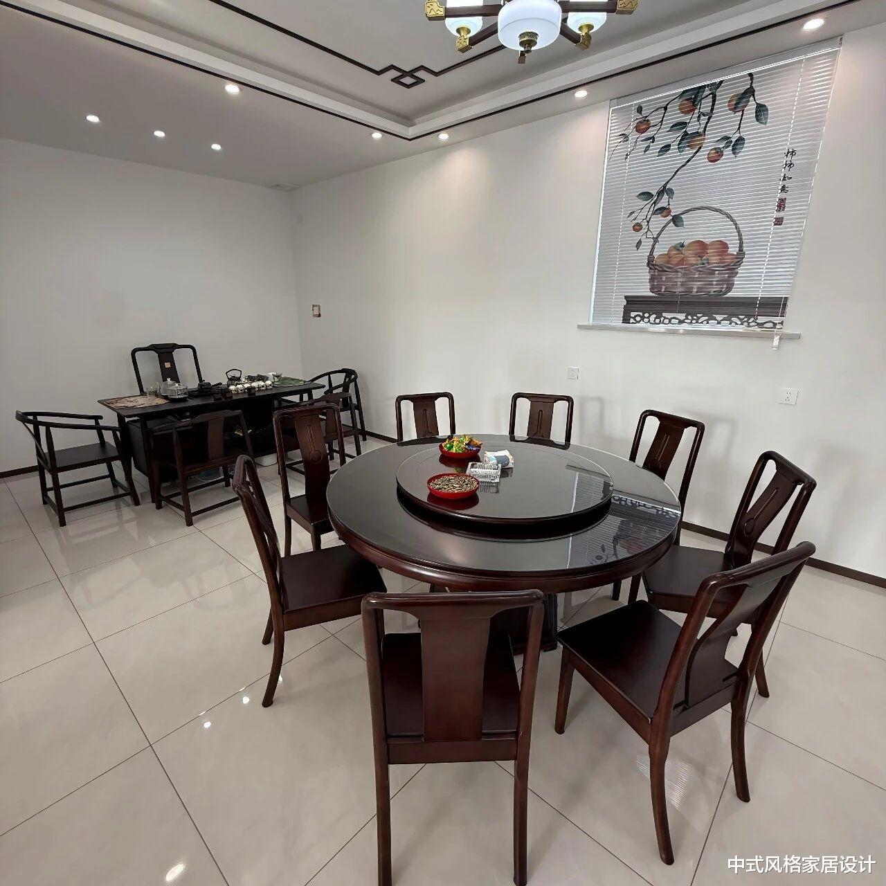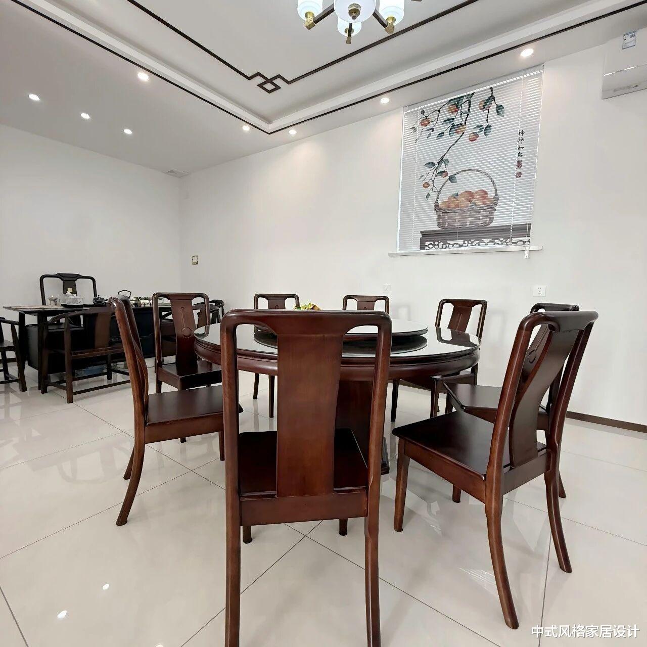 新中式风格餐厅,整体雅致温润。中央摆放深棕色实木圆桌,桌面嵌圆形转盘,搭配同色系餐椅,桌上摆放两碗水果与餐具。左侧设深色实木博古架,陈列茶具与摆件;右侧百叶窗悬挂水墨画,以竹篮、果实与书法文字为元素。顶部中式吊灯与筒灯结合,浅色瓷砖地面映衬木质家具,营造出传统与现代交融的用餐氛围。