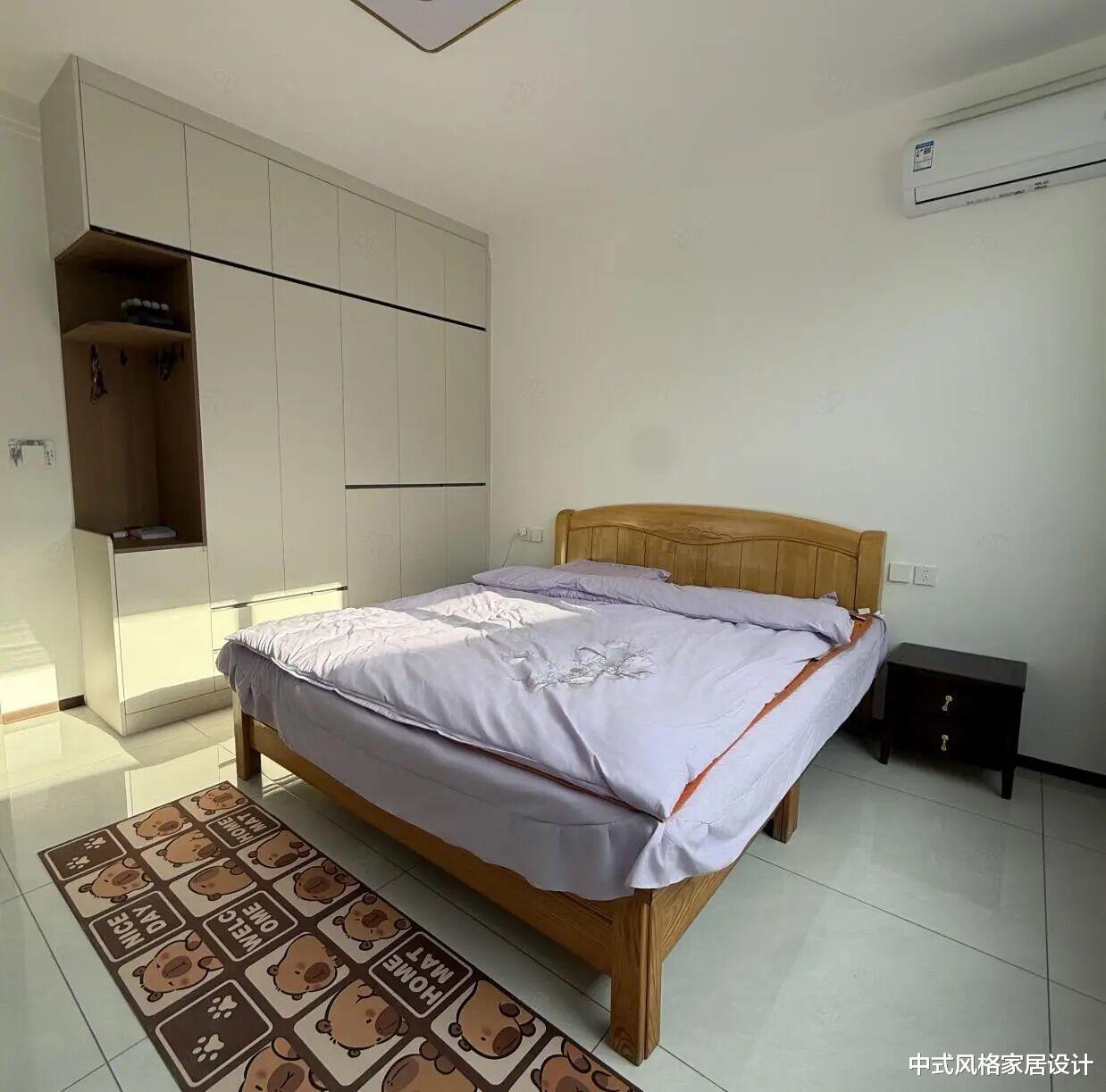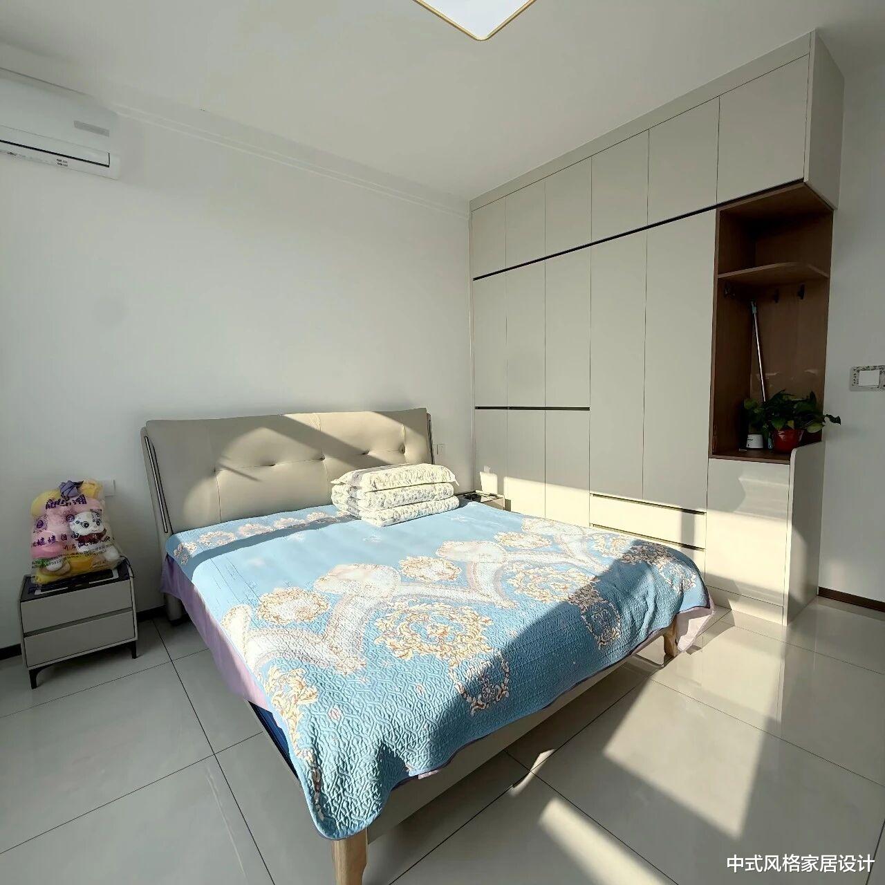 浅灰色软包床头搭配蓝色底纹床品,床尾铺有蓝紫渐变花纹毯子,叠放的白色毛巾整齐置于床头柜上。右侧为白色嵌入式衣柜,柜门线条利落,下方设有开放式格架,摆放绿植与小物件。床头左侧是浅灰色床头柜,台面堆放彩色包装物品。墙面为纯白色,左侧安装白色空调,地面铺浅色瓷砖,阳光透过窗户斜射而入,整体氛围温馨舒适。
