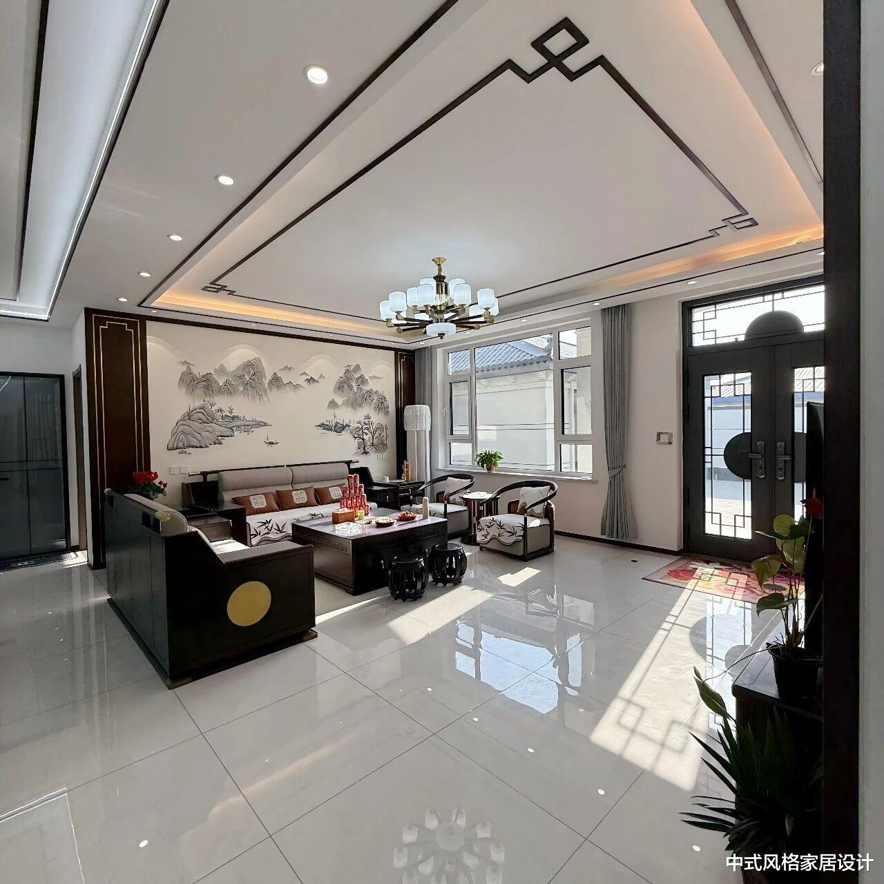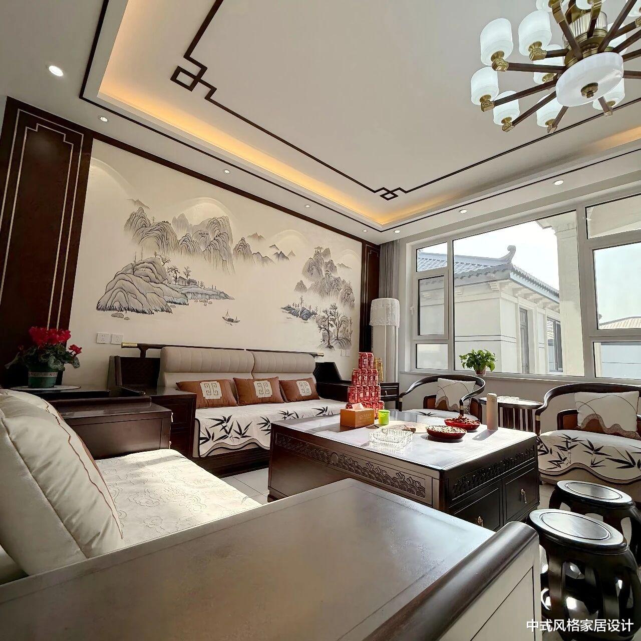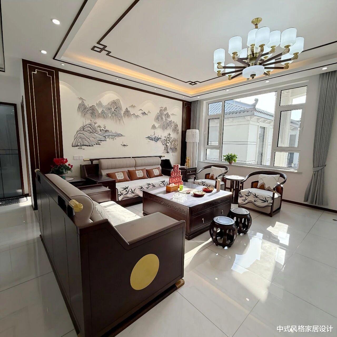 以深棕色实木家具为框架,搭配米白、浅灰等柔和色调,营造沉稳通透氛围。水墨山水画作,辅以木质边框与嵌入式灯带,凸显东方意境。L型布艺沙发、深色实木茶几、圈椅与鼓凳;茶几上摆放茶具与红色礼盒,窗边绿植与落地灯增添生机。顶部水晶吊灯与暗藏灯带结合,光线柔和;地面通铺浅色瓷砖,与实木家具形成材质对比,凸显质感。