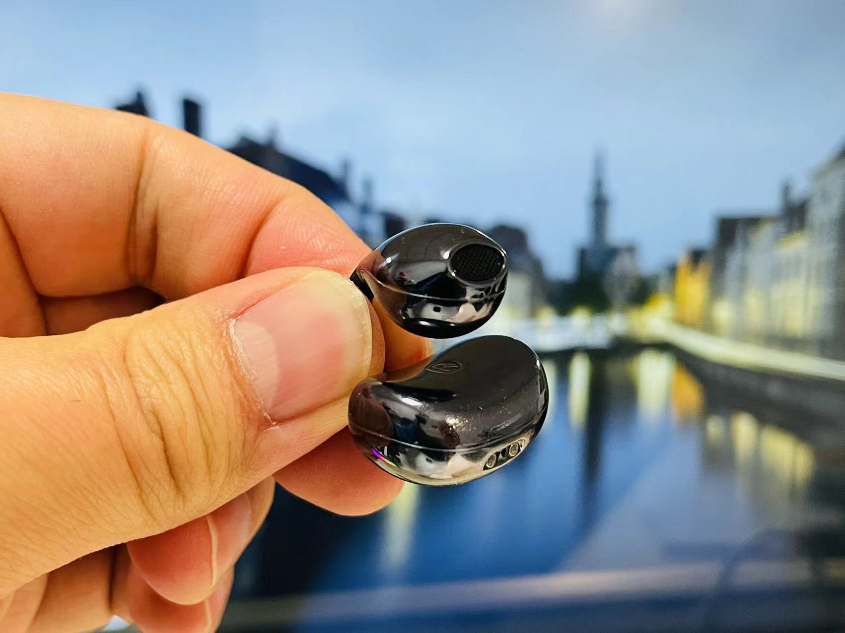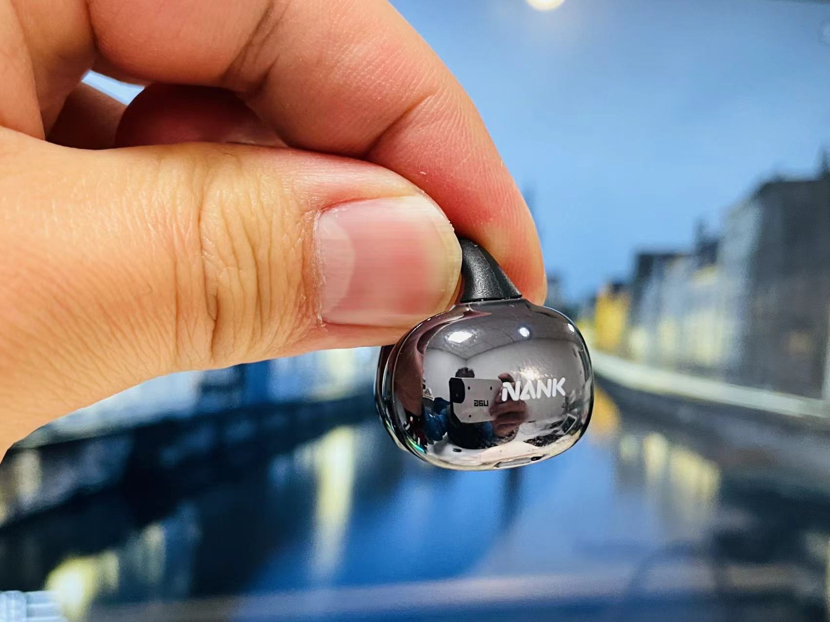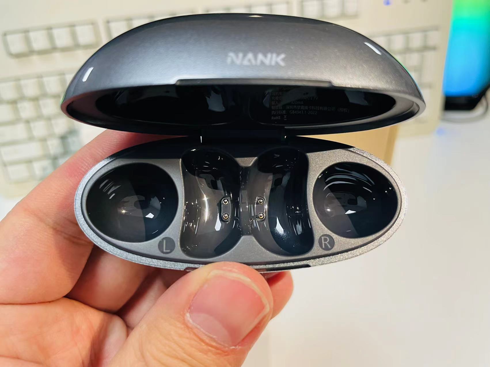耳机本体是以磁吸的形式连接充电仓的,左右两只耳机的外观是基本一致的,前面发声单元部分有点像水滴💧,后面是电池控制区域,写着NANK。整体看上去静谧低调。控制区域的内侧标着L和R,以区分左右耳。