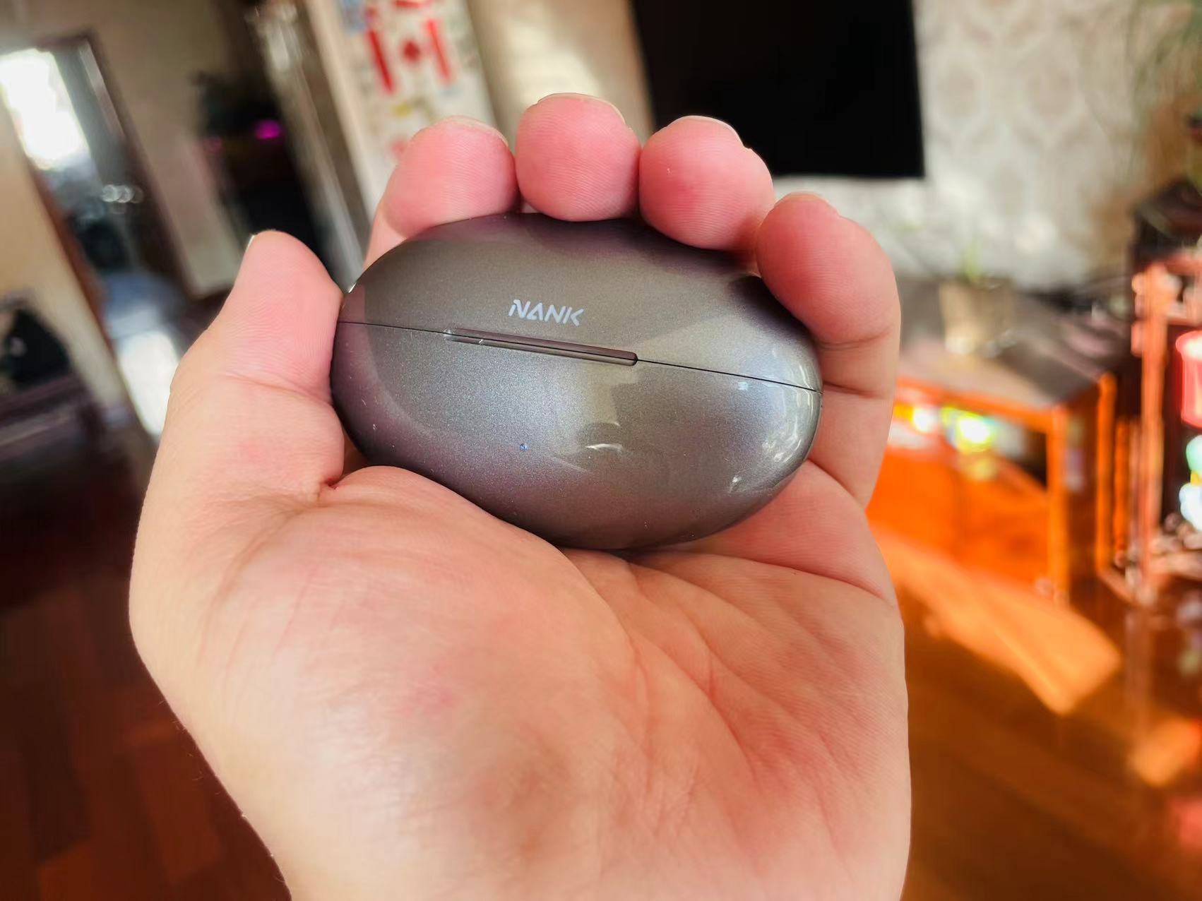 OE ultra的充电仓外形像一块椭圆形的鹅卵石,正面是NANK几个英文字母,背面是C口的充电口。摸上去圆圆的,很舒服。