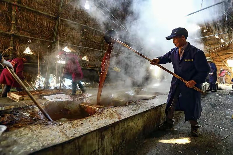 土法熬糖,至少要经过三锅三煮(熬),分步而成。将榨好的甘蔗汁水,先倒入第一口大锅,慢火煮,待沸腾起泡后,捞出表面浮起的杂质浮沫,倒掉沉淀过滤锅底的泥沙。然后,倒入第二口大锅中,继续熬煮加热,煮干水分,待青白色的汁水变成了淡黄色的甘蔗汁水后,再继续倒入第三口锅中,用大火煮,这是最关键的环节,熬糖师傅用一根长木棒,在锅内不断地搅拌,直至汁水慢慢变稠,成了浓稠的糖泥,颜色也由微黄变成褐红。