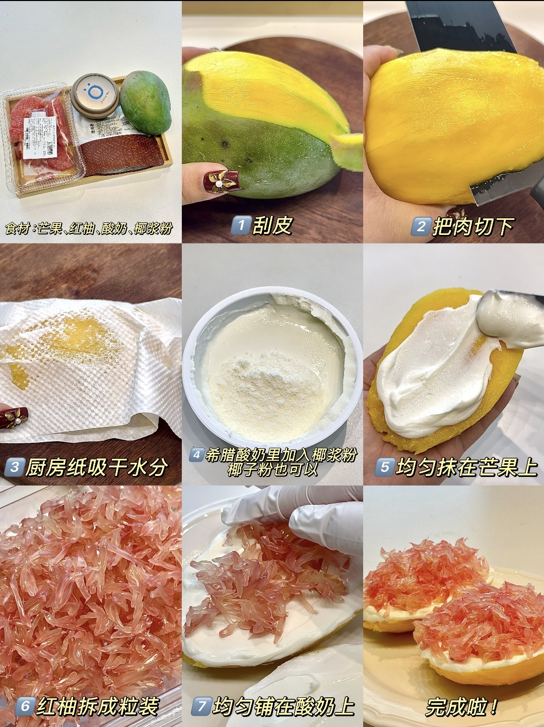你说这吃法是谁发明的?我猜大概率是某个吃货在家捣鼓零食时,冰箱里只剩芒果、酸奶和红柚,灵机一动就把它们凑一块了。就像咱们普通人做饭,总有那么些“突发奇想”的时刻:剩饭做个蛋炒饭,剩菜凑个乱炖,反而吃出了惊喜。