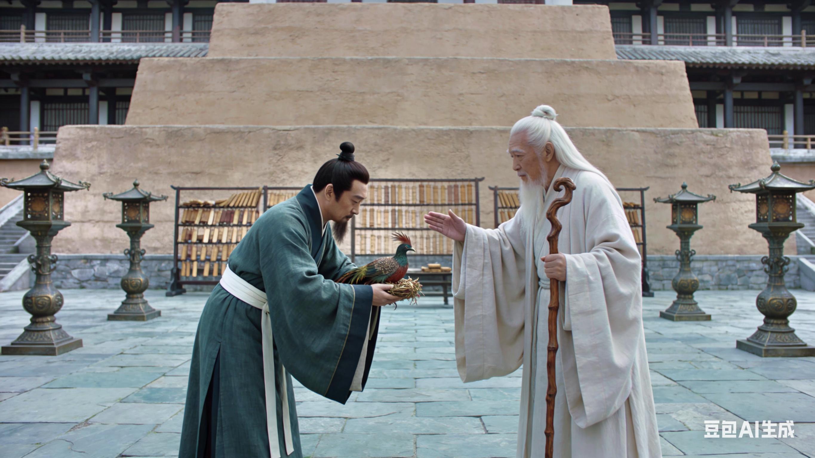 公元前518年,孔子抵达洛阳,见到了早已名满天下的老子。老子白发垂肩,如雪覆顶,身着宽松的麻布宽袍,面容淡然如水,抚着长须端坐于茅舍之中,案上摆放着泛黄的竹简,周身透着超然物外的气度。