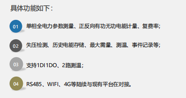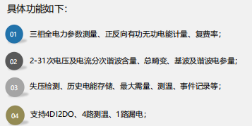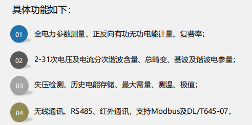 2、功能丰富,支持双向计量、谐波分析、测温及漏电检测、报警输出等功能;
