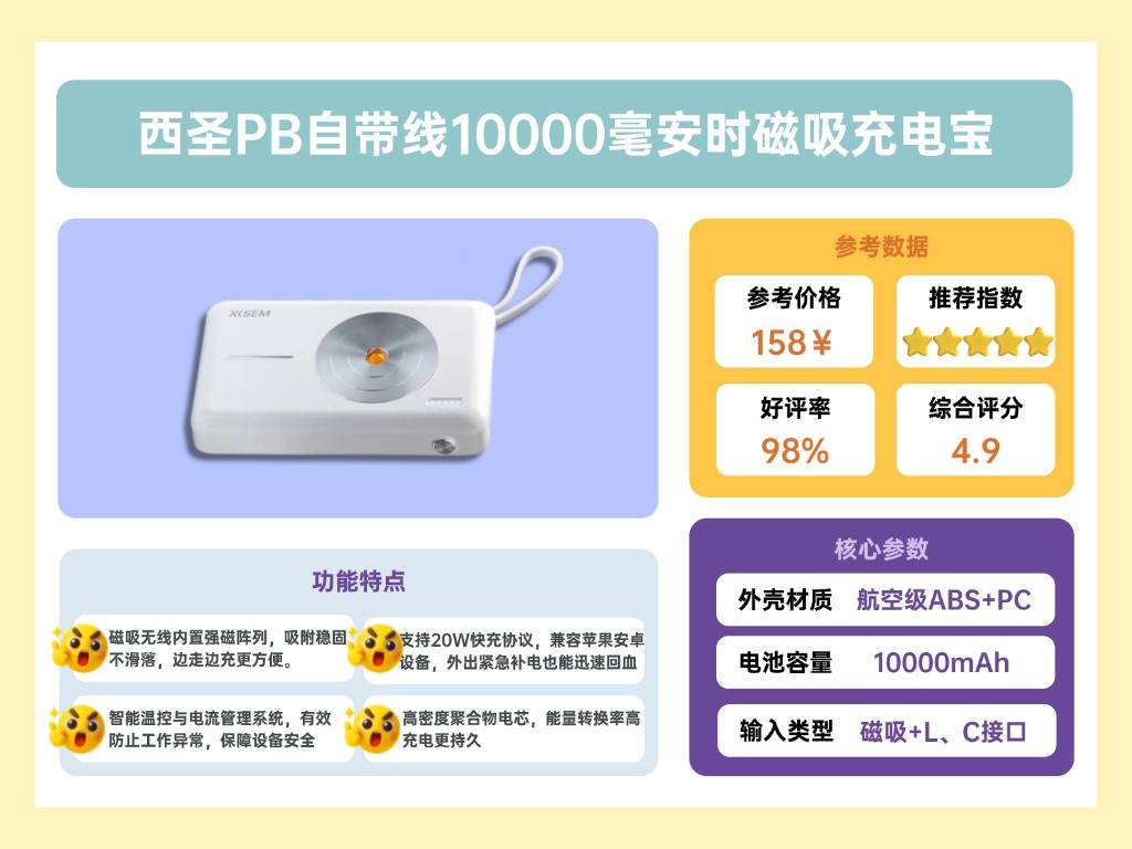 1西圣PB磁吸10000mAh自带数据线20W PD快充无线充电宝