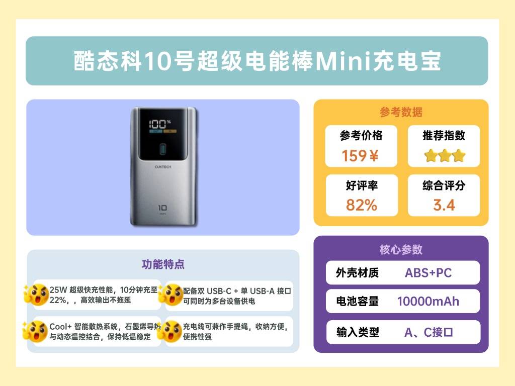 酷态科这款充电宝体积小巧却有10000mAh容量,双 USB-C 加 USB-A 的三口设计,能同时满足多设备充电需求。25W 快充实力不错,给 iPhone 16 Pro Max 半小时就能充到 70%,应急补电很快。