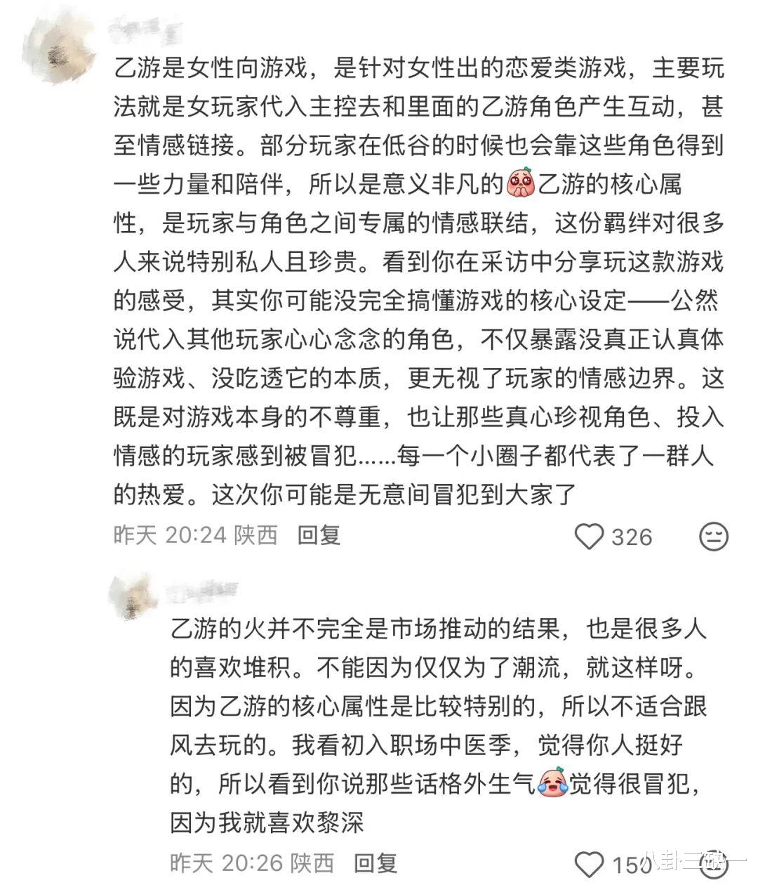 怎么就因为提了句乙游,就招来这么多想在虚拟世界里寻求专属被爱幻想、弥补情感空缺的女性群体不满?