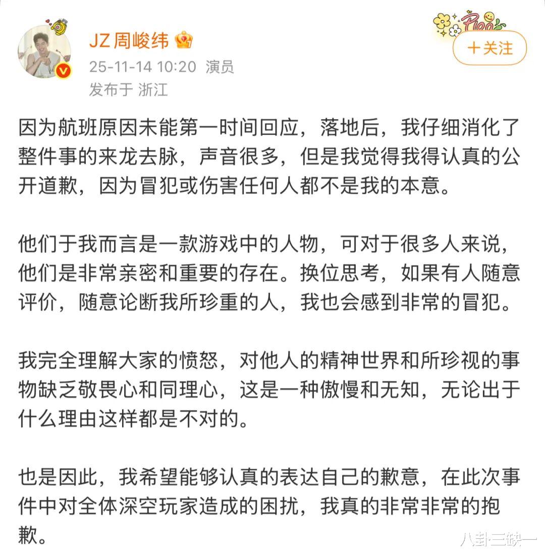 争议刚发酵没两天,他的道歉声明就光速抵达,内容写得那叫一个诚恳,反思自己“对他人珍视的事物缺乏敬畏心”、坦承“这是一种傲慢和无知”,还特别强调“乙游男主对很多人来说是非常亲密重要的存在”,看起来态度是到位了。