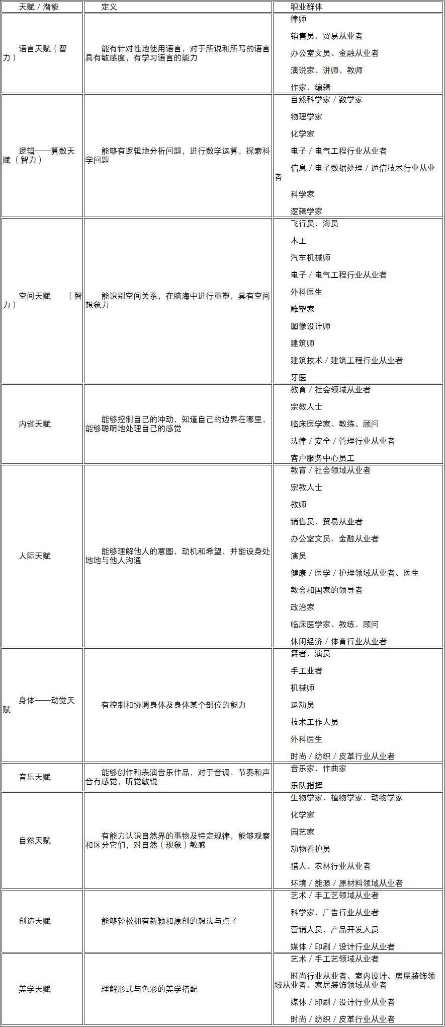 汉斯的例子主要涉及空间能力。在书中,作者先是给出了近40道自我测试题,然后依据自己的DIPS分类法,列举了10种与特定职业群体相关的天赋/能力,方便每位读者按需要了解。以教育工作者为例,作者认为如果想成为教师,应当具备语言天赋、内省天赋和人际天赋,也就是要有良好的表达能力,能够控制自己的冲动,理解自己和他人的情绪,并且善于在人与人之间斡旋。而具体到教授某门科目时,又需要进一步考虑,比如数学老师和物理老师需要具备逻辑-算数天赋,而舞蹈老师和体育老师需要具备身体-动觉天赋。