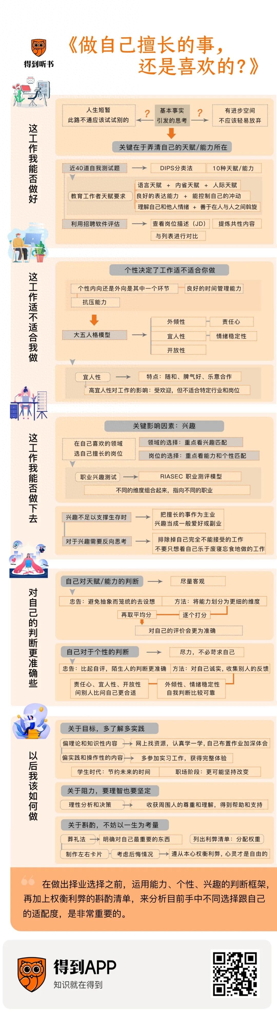 而现在,我们也可以回答书名中的那个问题了:做自己擅长的事,还是喜欢的?其实,最理想的路径是,在自己喜欢的领域,选自己擅长的岗位。换句话说,领域的选择,重点看兴趣匹配;岗位的选择,重点看能力、个性匹配。