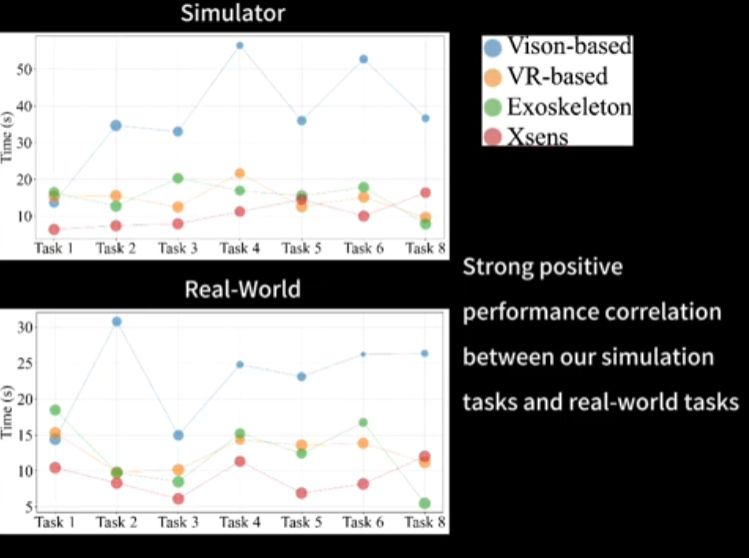 在模拟和真实实验中,性能趋势保持一致。运动捕捉管线中使用MANUS数据手套和Xsens,MVN实现了最高的成功率和最快的完成时间。其在抓取、放置和双手协调方面表现出卓越的精度,具有很强的模拟到真实场景的转换能力。