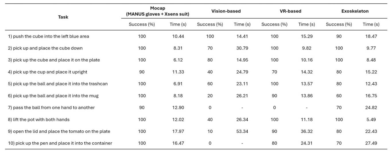 TeleOpBench结果表明,由MANUS数据手套Xsens全身动捕系统提供的高保真手指和肢体跟踪在被评估的系统中提供了最准确和有效的遥操作数据。