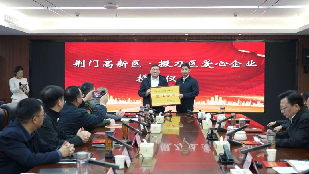 掇刀区委书记、区长、荆门高新区党工委副书记、管委会常务副主任王玮,荆门高新区党工委副书记、掇刀区委副书记、区委政法委书记张龙,区人大常委会党组书记、主任官斌,区政协党组书记、主席胡爱玲,荆门高新区党工委委员、管委会副主任、掇刀区委常委、常务副区长陈启富分别为国能长源荆门发电有限公司、湖北固润科技股份有限公司、湖北龙星钢构有限公司、荆门市荆腾源商贸有限公司、荆门展翔文化用品有限公司等五家爱心企业颁发了奖牌。