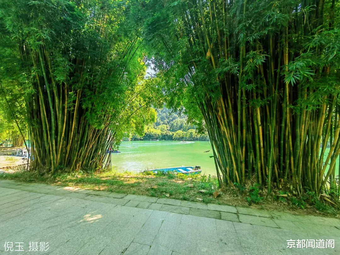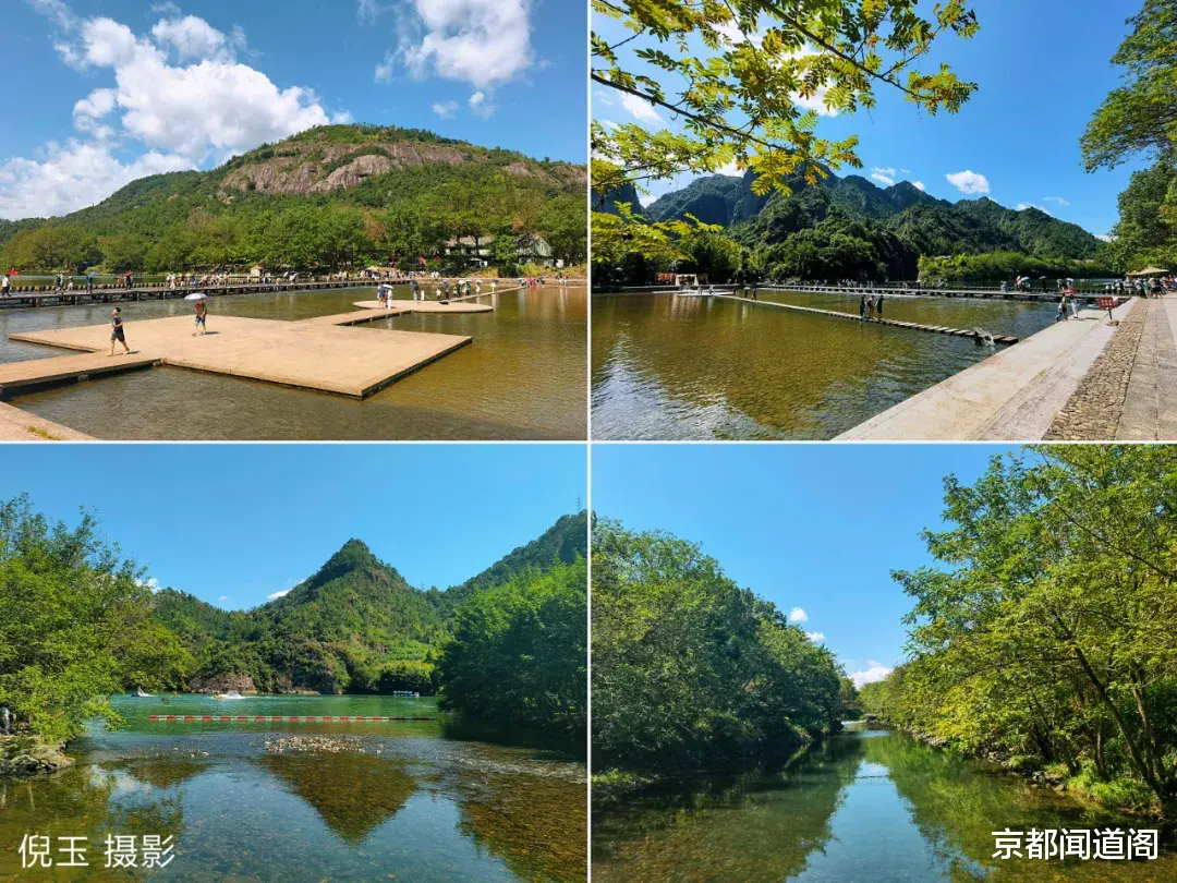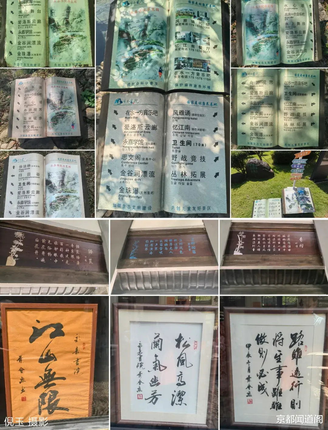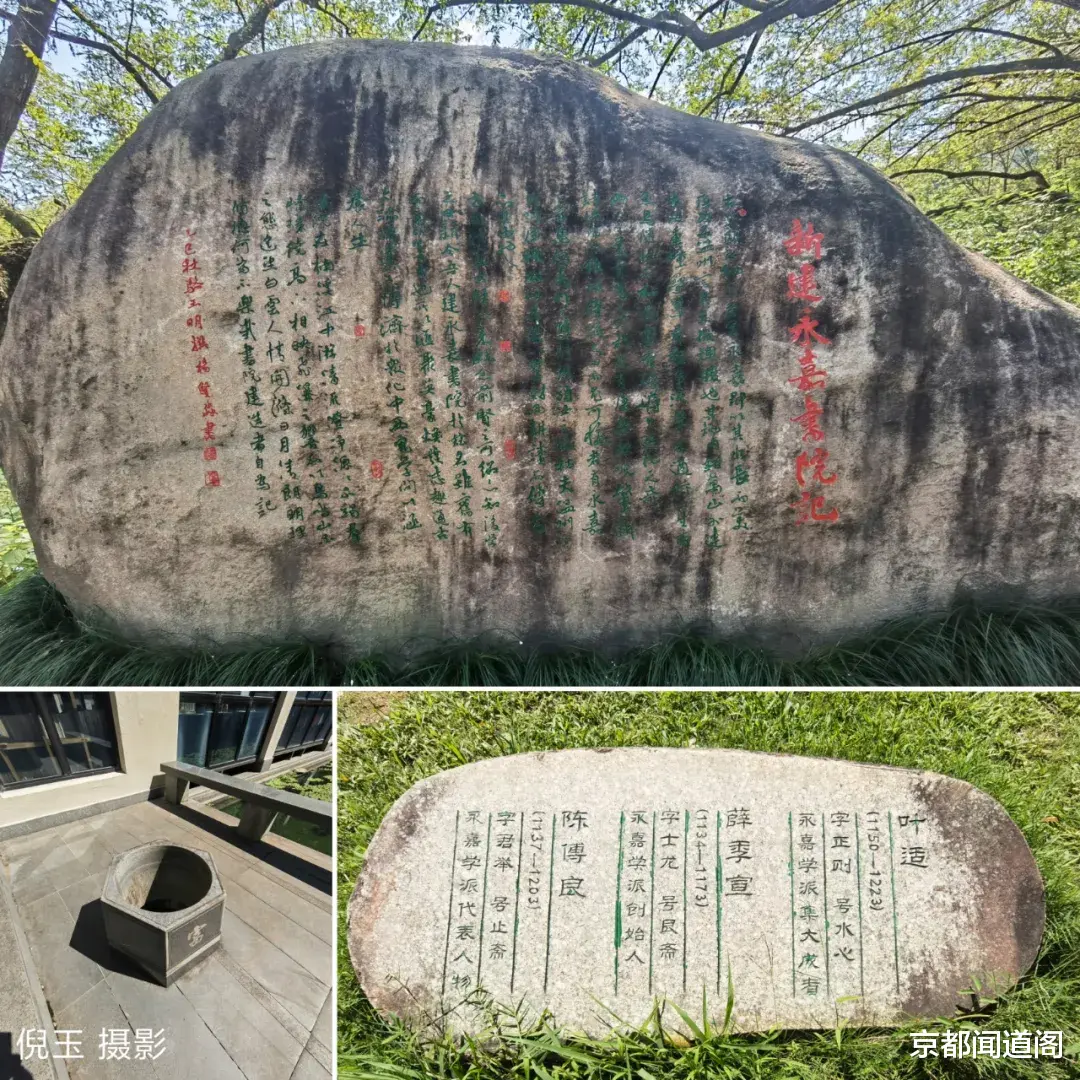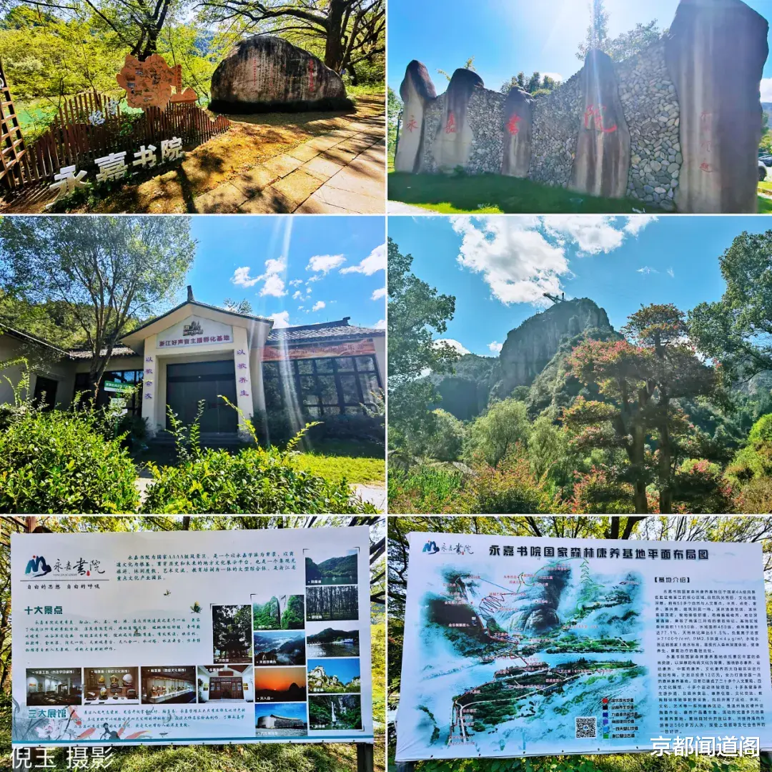 顶着38度的高温快步前行,距离游客中心大门还有300米左右处,已故国学大师南怀瑾先生题写的“永嘉书院” 四个红色大字映入眼帘。字迹古朴俊秀,矗立交通要道一旁格外醒目。如果当初选择乘坐竹排从水路去书院大门,自然就会错失掉此次眼缘与欣赏。在门前广场的旅游中心购票后,通过门禁系统进入景区,风光瞬间换了模样。浓密的树荫遮挡住烈日,温度骤降不少,让人倍感舒畅。溪床清澈见底,滩林蓊郁苍翠,一些水上旅游项目正在进行……行进方向左侧依次陈列着永嘉书院国家森林康养基地平面布局图、永嘉书院景区介绍及《新建永嘉书院记》石刻。这些不仅方便游人快速了解景点概况,也成为拍照留念的绝佳背景。复旦大学教授骆玉明在《新建永嘉书院记》中写道:“世风代变,古往今来;既念前贤之可绍,亦知后学之日新。今吾人建永嘉书院于兹,名虽旧有,而意非复古也。所以汇聚英豪,焕发志趣。通古今,论商道之博济于众;化中西,究学问以涵养人生。”