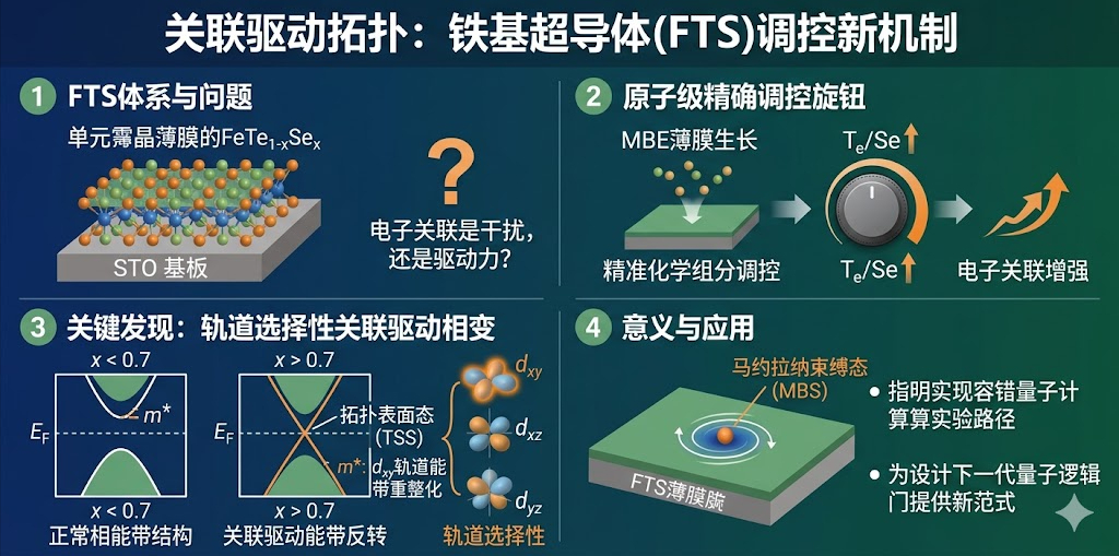 铁基超导体FeTe_{1-x}Se_x(FTS) 家族一直是研究拓扑超导的理想平台。早前的研究发现,这类材料在某些特定组分下具有拓扑表面态(TSS)。但一个根本性的问题始终悬而未决:电子关联究竟是促进了拓扑态的形成,还是仅仅是一个干扰项? 如果能像调节收音机频率一样调节电子关联,我们能否随心所欲地开关拓扑超导?