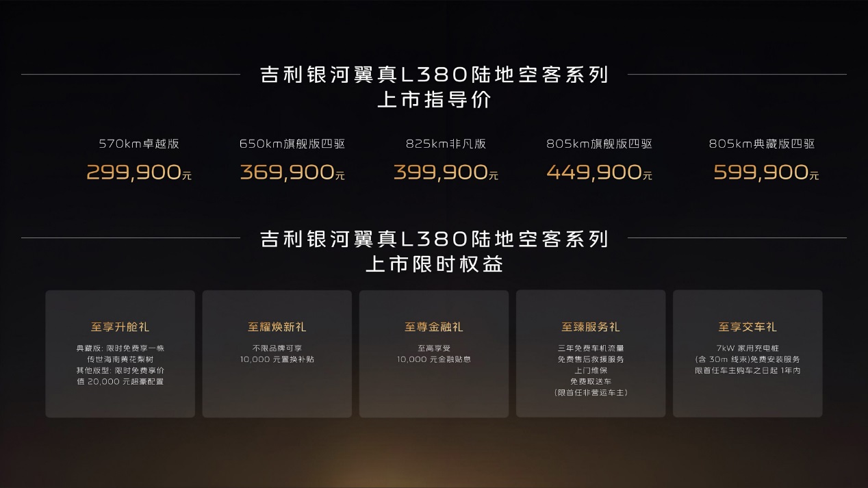 当然,现阶段,翼真用1座版、8座版、黄花梨典藏版进行L380差异化销售,但真正需要改变的,其实是合并后的技术协同,加速翼真车型的迭代与升级,在各个技术层面与银河品牌同步,将千里浩瀚智驾等技术上车,才能实现产品竞争力跨越式的提升。