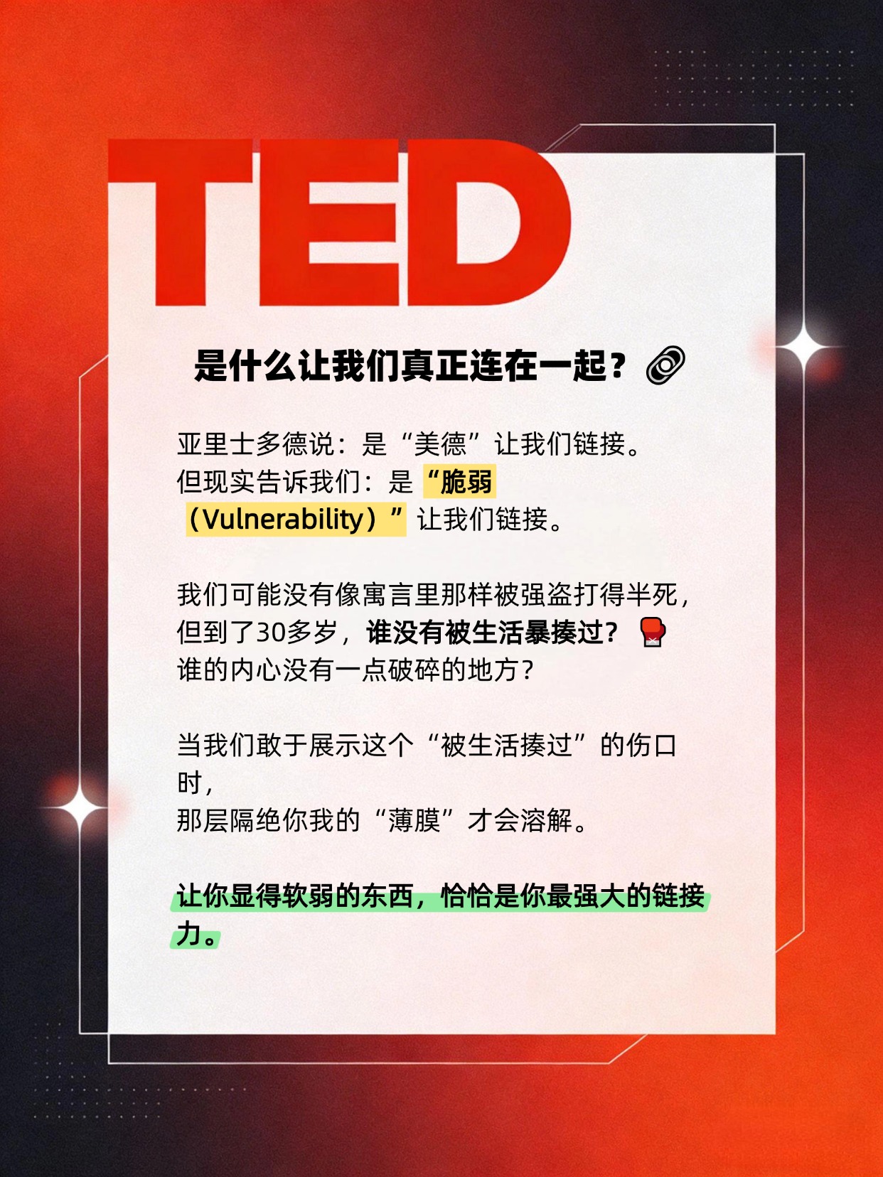 3. 脆弱即力量: 亚里士多德认为我们因“优秀”而链接,但其实我们因“破碎”而相遇。30+的人,谁没被生活揍过呢?那是我们彼此认出的暗号。