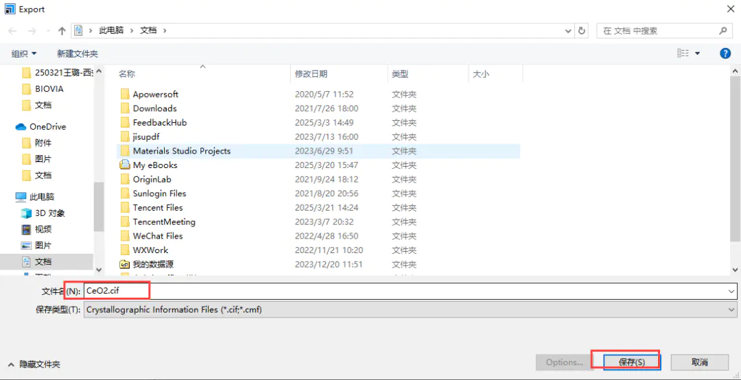 3.修改准确的文件名并点击保存,即可得到对应结构的.cif格式文件,示例为CeO2.cif.。