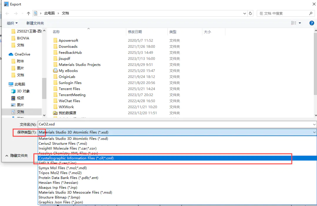 2.在打开的Export窗口中下拉保存类型,选择Crystallographic Information Files(*.cif;*.cmf),把导出的文件格式修改为比较通用的cif格式文件。也可以根据需求选择其他类型的格式。