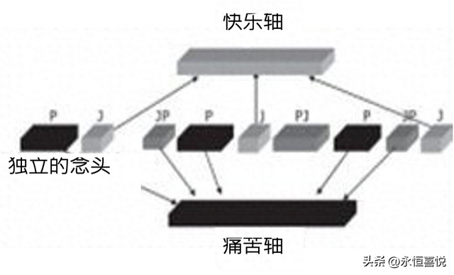 你脑海中的每一个念头都显示为正方形或矩形,每个都有不同的形状,大小和颜色。不同的念头在你身上不断浮现,一个可能与疼痛或痛苦经验有关;另一个可能与快乐或快乐经验有关;下一个可能与快乐有关,但你认为它是痛苦,它在图表上被称为 JP - 快乐的经历,痛苦的印象。同样地,你可能有痛苦经验的念头,但你认为它是快乐的,它被称为 PJ--痛苦的经验,快乐的印象。