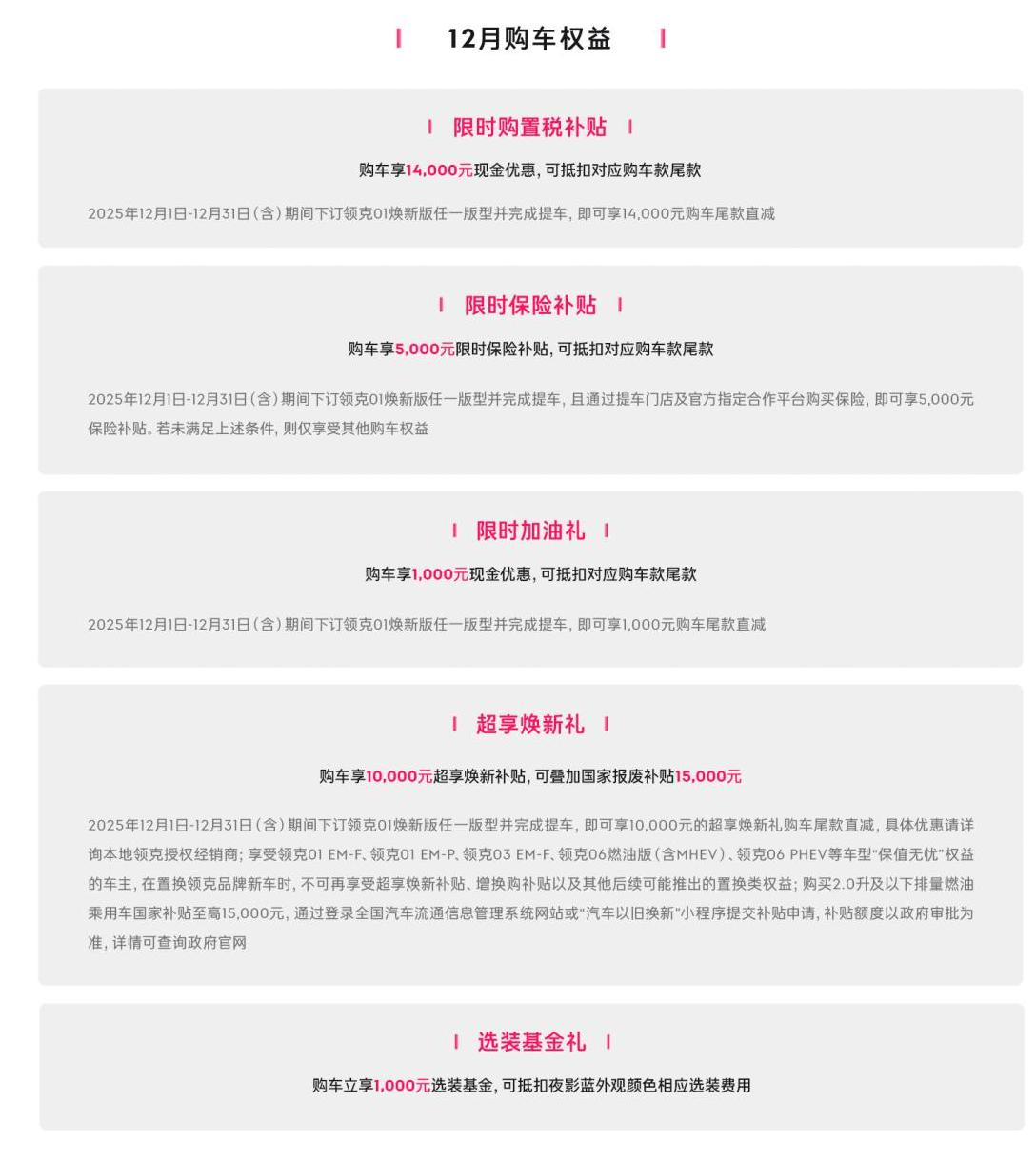进入12月,领克01焕新版同步推出多项权益,包括14,000元购置税补贴、5,000元保险补贴、1,000元加油礼、10,000元超享焕新补贴和1,000元选装基金。同时,如果用户符合条件,可叠加国家报废补贴最高15,000元。只要在2025年12月1日至12月31日下订并提车即可享受。对准备在15万左右预算内购车的消费者而言,这些权益直接降低整体使用成本,使年底成为最具质价比的入手时点。